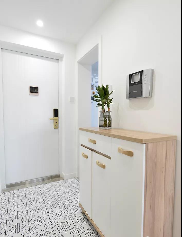 ▲ 玄关整体干净明亮,白色与木色搭配的鞋柜,在几株绿植的点缀下,清新自然。黑色线条的地砖增强空间视觉感与层次感。