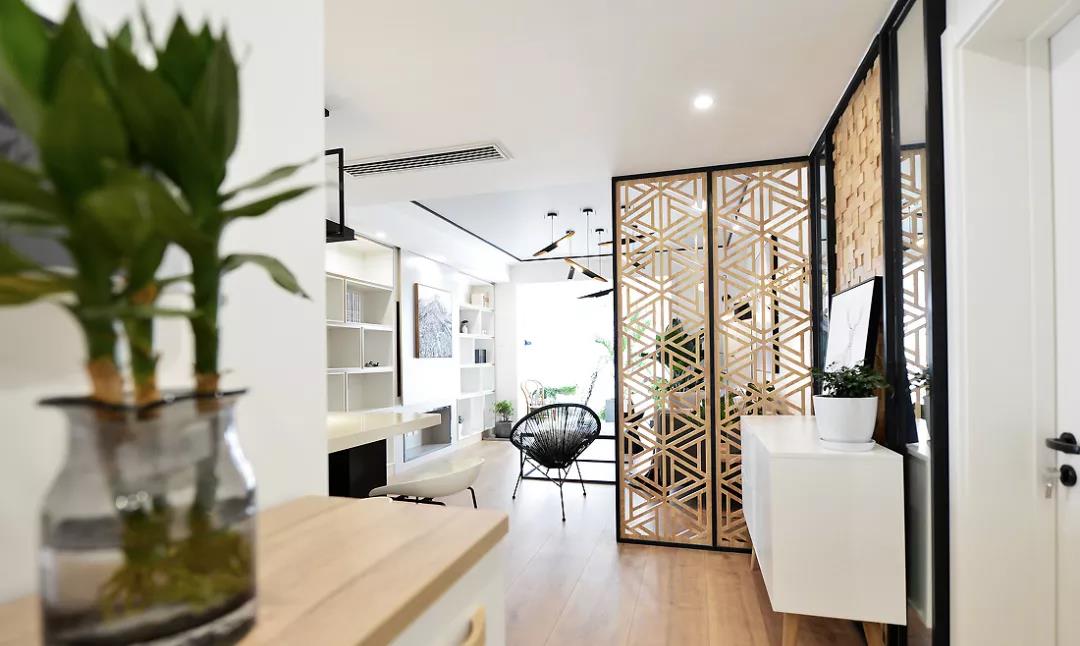 ▲ 站在玄关望向室内,一扇黄黑两色相间的屏风挡住了视线,避免视线直接落入客厅,似隔非隔,简约朦胧。