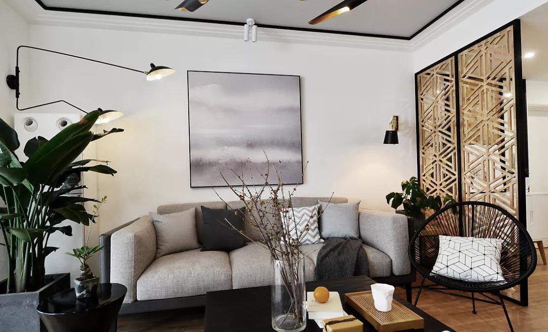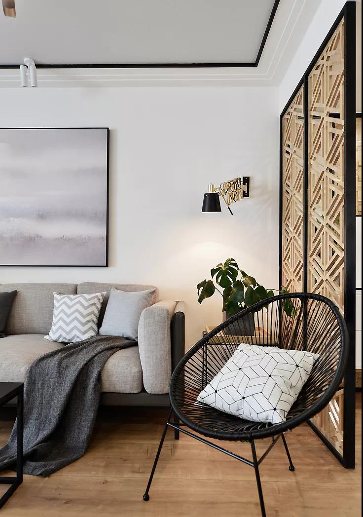 ▲ 黑色线条简洁利落,共同打造了空间特有的层次感。灰色系沙发低调淡雅,与沙发背景墙上的装饰画相呼应,营造宁静悠然的意境之美。
