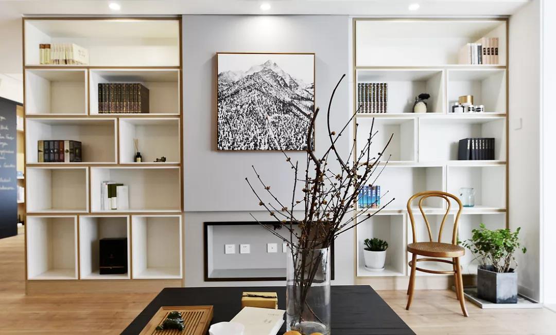 ▲ 两侧做了展示柜的设计,颜色温润柔和,可以进行收纳和展示一些收藏的物品。