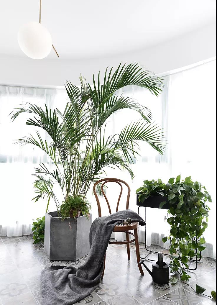 ▲ 阳台以白色窗帘围绕,带来朦胧雅致的格调。绿色盆栽满满的清新活力,一把木椅林立其中,搭一条灰色毛毯,随性适意。
