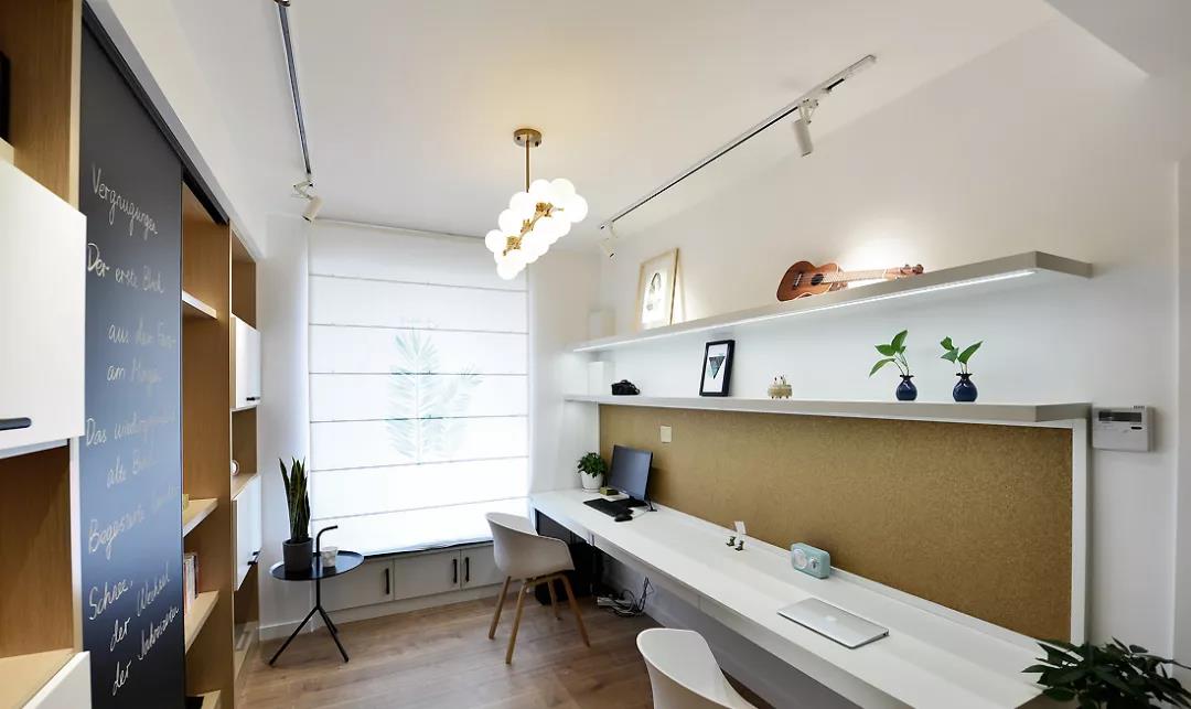 ▲ 超长的工作桌满足二人同时办公,整体以白色和木色搭配,清新自然。