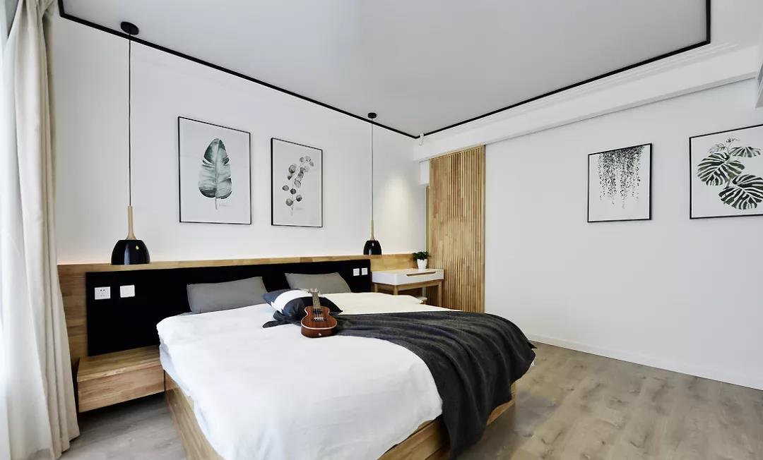 ▲ 主卧风格简约,黑色床头及灯具的点缀,为卧室增添颇具质感的格调。