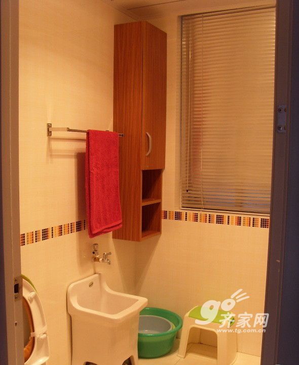 2、传说中的侧柜,超实用,放这里洗澡时候换衣服就不愁了~百叶窗30元,跟窗帘一起订货的。墩布池65元。