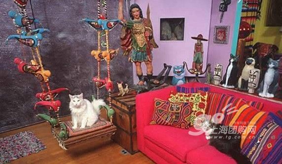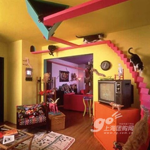 这是天花的效果~多么明亮艳丽的色彩搭配~柱子上缠绕麻绳,可以方便让猫猫们爬上爬下。