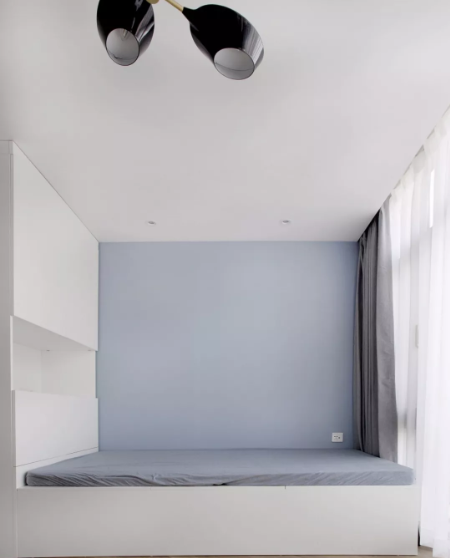 主卧的床头墙使用淡灰色,中性色能平复人的心情,让主人安然入睡,床头窗户下方设置储物地台,兼具床头柜功能。床头选择柔软舒适的软包靠背,躺在床上,倚在靠背,一天的疲劳就能一扫而光。
