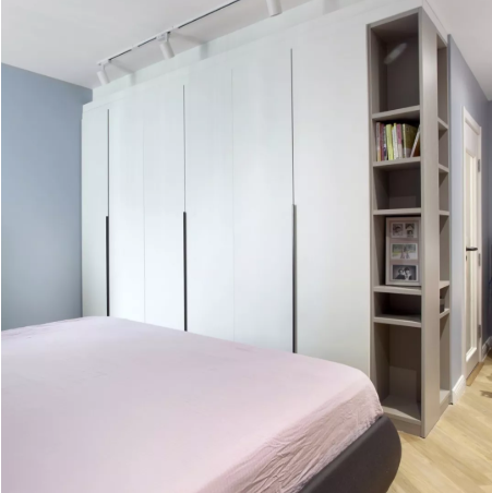 床尾设置储物柜并配有开放格,开放格储物柜层次感和格局的设计都让卧室变得分外鲜明,而且开放格储物柜在设计上更具有几何性。