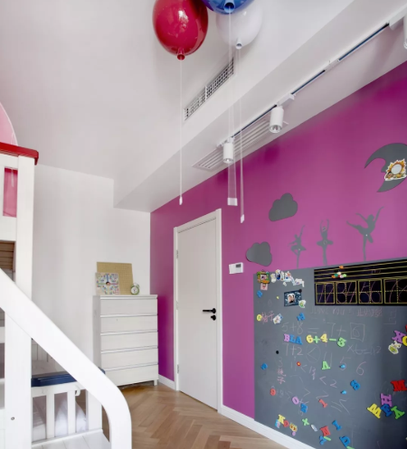 儿童房采用活泼的玫粉色,墙壁上粘贴的墙纸,适合小朋友写写画画,同时容易更换,有益于保持房间的干净整洁,红白蓝三种颜色的气球灯让儿童房充满童趣。