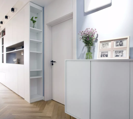 电视墙是用长条形乳白色木板拼接而成的,错分的格子,电视墙通高到顶,这使客厅的存储面积大大增加,电视墙有隐藏的滑轨,电视不用时便可以拉上木门将其隐藏,适合有孩子的家庭。