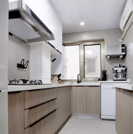 厨房选用墙地同一个系列的瓷砖,使整个厨房具有整体性,为节省空间,利用一切可利用的空间,微波炉挂在墙壁上,冰箱塞进台板下特意预留的空隙中。