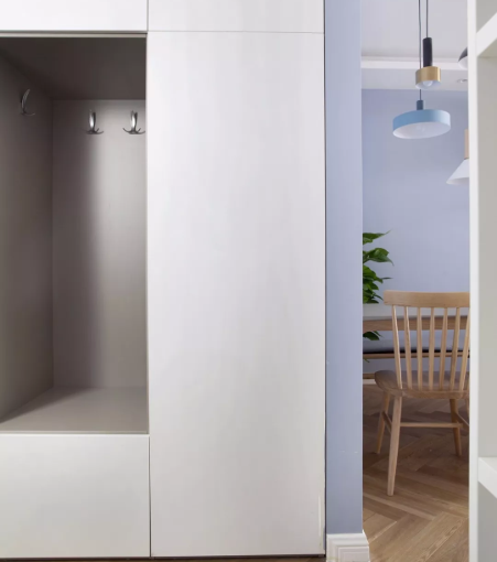 在玄关处,利用玄关和客厅错开的墙壁空间设置衣帽柜,在衣帽柜里兼具换鞋凳功能,也便于出入门时换鞋用。