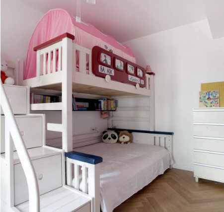 子母床采用上下层设计,上面姐姐使用,下面妹妹使用,楼梯收纳盒的设计增加儿童房的收纳空间。