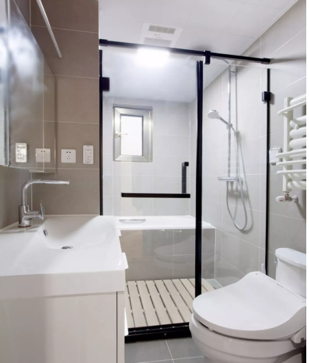 卫生间干湿分区,洗浴区既能淋浴也能坐浴,且洗浴区放置了防滑木垫,不仅能让水快速排出,还能有效防止家中的老人和小孩在洗浴时摔倒,一举两得。