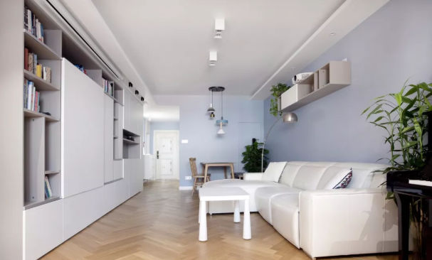 客餐厅互通,中性的白色和冷色调的淡蓝色搭配,让客厅倍显宁静,适合一家6口人在此享受天伦之乐。