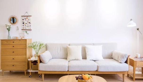 客厅地面通铺木地板,选用同色系简约的木色家具,留白墙顶面无过多装饰,呈现出清新自然的舒适感。