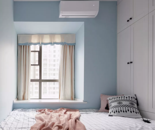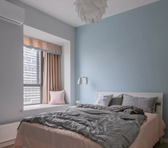 主卧,柔和的蓝色化解了粉色带来的甜腻,更多了一份让人身心舒畅的清新感。休憩空间无需过多修饰,蓝灰色基调搭配白色床架与造型吊灯,粉色床品以整屋的粉调呼应。