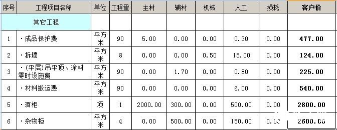 水电安装费用一般都比较贵,基础工程中还包括拆墙费用和成品保护费等费用,总预算在13875元。