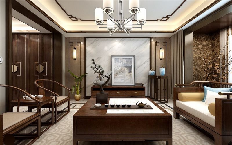 国盛首府新中式风格110平米三居室装修案例风效果图