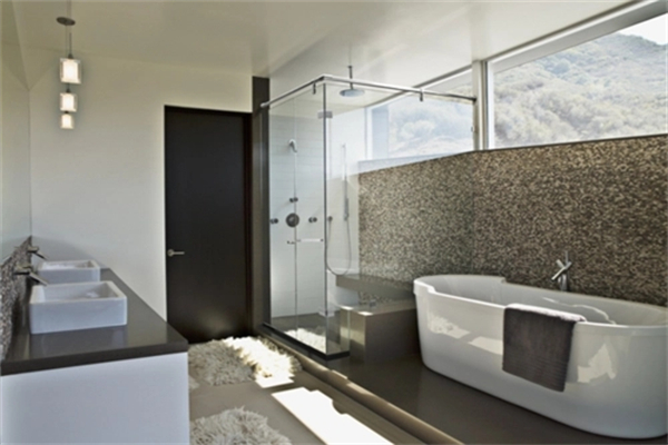 卫浴间的墙面瓷砖要注重防潮、防水,而且贴瓷砖时要保证平整,并要与地砖通缝、对齐,以保证墙面与地面的整体感;如遇到给水管路出口,瓷砖的切口要小、适当,方便给水器上的法兰罩盖住切口,使得外观完美和自然。
