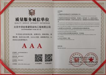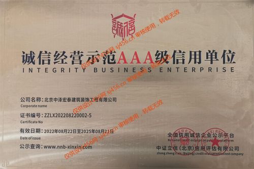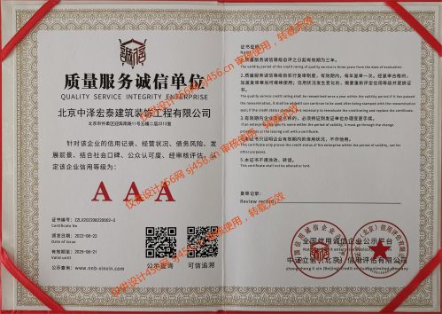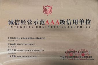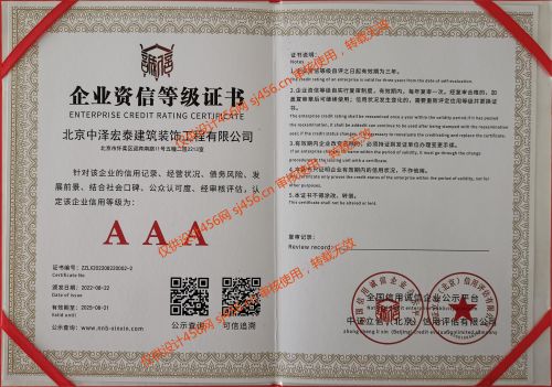 北京中泽宏泰建筑装饰工程有限公司成立于2018年,公司拥有国家建设部核发的建筑装修装饰工程专业承包贰级、取得国家ISO9001质量管理体系认证、ISO14001环境管理体系认证及GB/T28001-2001职业健康安全管理体系认证等。是中国建筑协会会员单位,荣获“全国建筑装饰行业AAA级诚信企业”。 企业宗旨:设计和施工保证工期和质量,让客户满意; 经营理念:厚德载物,诚信赢天下; 管理理念:用制度管理,按流程办事; 人才理念:以德为先,德才兼备,人尽其才,奖罚分明; 安全理念:警钟长鸣,安全为天; 质量理念:工匠精神,百年中泽;