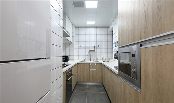 厨房定制U型橱柜,最 大程度提高空间利用率,冰箱、烤箱、消毒柜等厨电都采用嵌入式放置,简洁且有序,并为厨房台面留出更多烹饪操作的空间。
