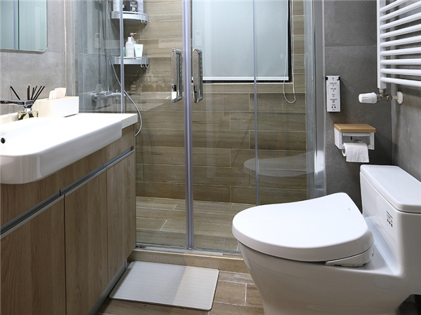 淋浴房与洗漱台、马桶之间采用透明玻璃分隔开来,干湿区合理分离,让日常使用的便捷舒适度提升了不少,尽管空间比较紧凑,但依然在保障各功能基础上尽量使活动空间宽敞。