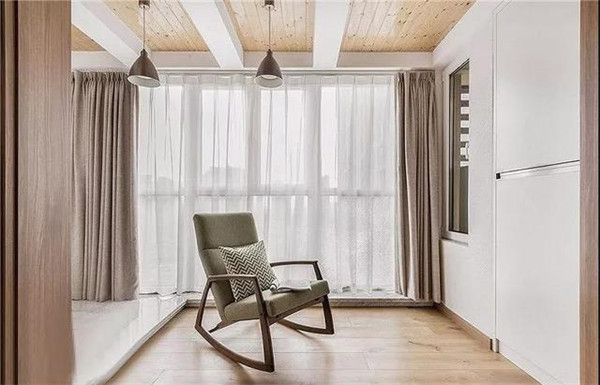 阳台区域有一排落地窗,阳光透过纱帘照进来,冬天坐在这里看书睡觉,温暖又惬意。