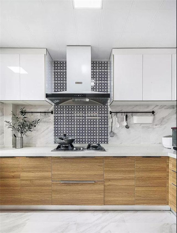 厨房的布置非常简洁,实木色搭配黑白色,让厨房瞬间高级起来,特别是中间马赛克的区域,弱化了抽油烟机的存在,让厨房更有创意感。