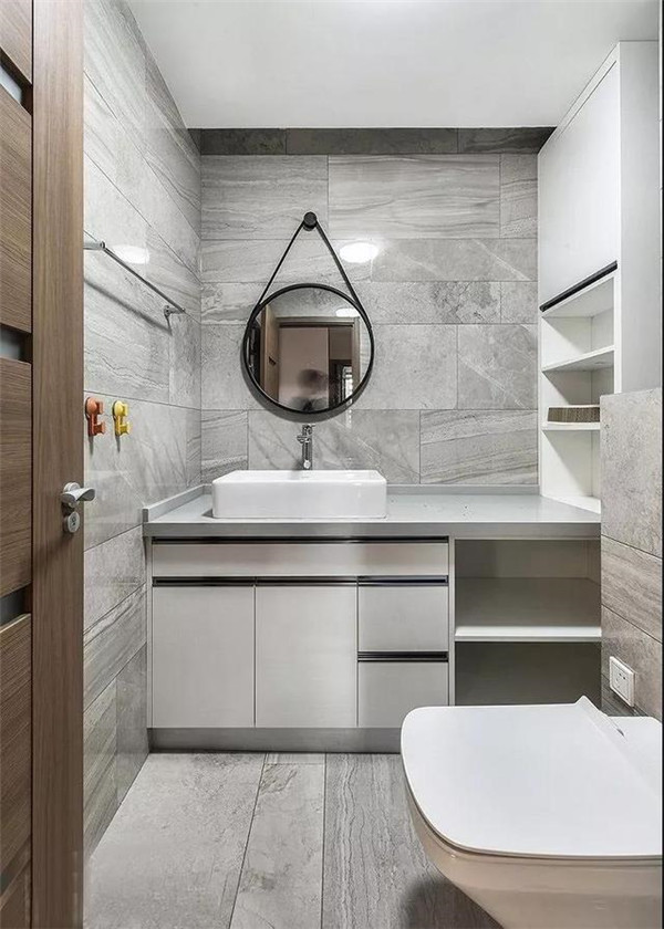 卫生间灰色与白色结合,简单又干净。洗手台的位置预留了很多收纳的空间,女主人有再多化妆品都可以放下。