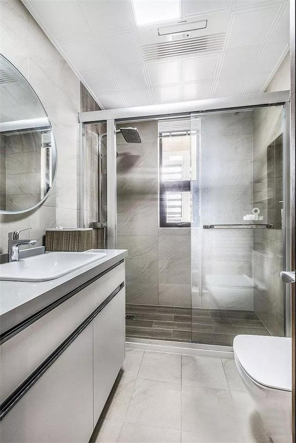 淋浴区与洗手台进行了干湿分离,玻璃移门将两个区域隔开来。