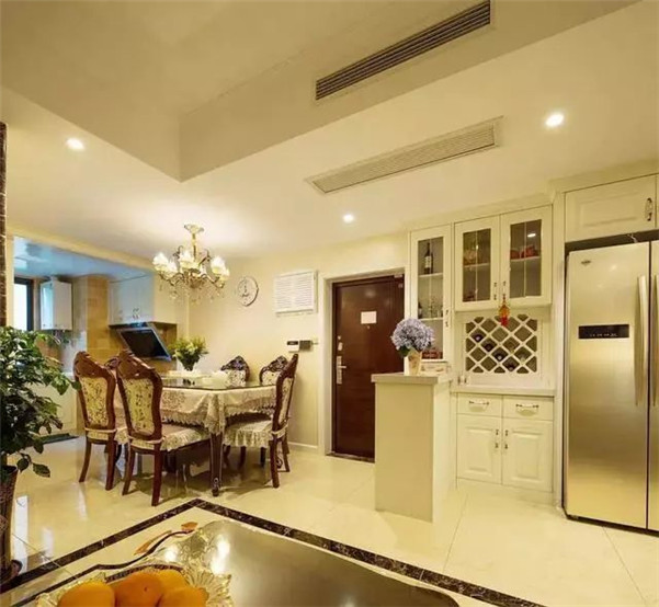在玄关和餐厅空间直接用半开放式的玄关隔断,上隔断下柜体的造型可以兼并收纳和遮挡的功能,也很好的释放了入室墙边的空间,不会进门就觉得拥挤。