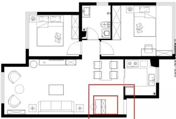 解决:可以在图2位置空间设计一个小隔断,可以化解大门正对卫生间/卧室的不良风水作用;若要保证玄关的实用性,可以将收纳柜设计在大门靠墙或者隔断边上都可以。