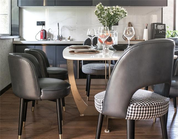 ▲连着客厅的餐厅同样有着多元化风格,优雅精致的餐桌椅造型简单,精练的线条在空间内落落大方,加入黄铜色的点缀,令这个区域变得现代轻奢起来。在顶上安装的灯具,满身金色,更加凸显了主人的时尚品味。