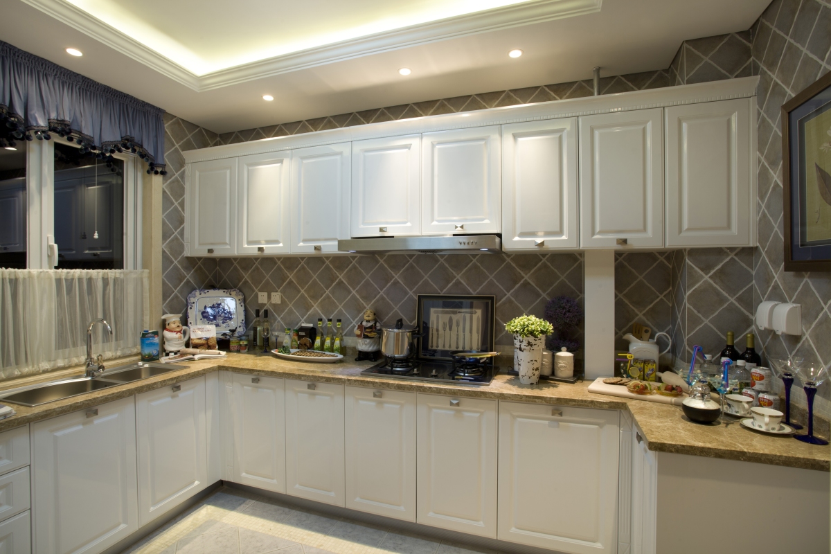 厨房灯光需分成两个层次:一个是对整个厨房的照明,一个是对洗涤、准备、操作的照明。后者一般在吊柜下部布置局部灯光,设置方便的开关装置,还有现在的性能良好的抽油烟机一般也照有灯光、对烹饪是足够了。