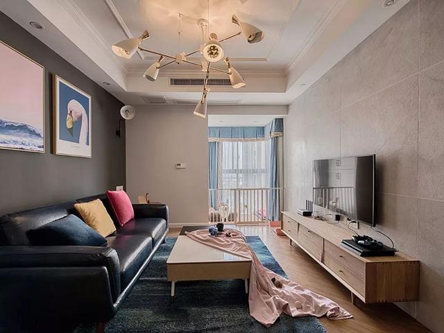 客厅与阳台之间采用开放式的设计,把阳台还改造成了一间宠物窝,这样就能更轻松地养狗狗了。客厅背景墙采用高级灰色的格调,与周围浅咖色得墙壁形成了鲜明的对比,显得层次感十足。黑色的皮质沙发非常经典大气,搭配亮色的抱枕,既清新自然又大大提升了客厅的舒适度。