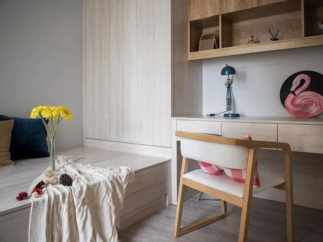 次卧的面积比较小,采用榻榻米的装修方案,这种一体化的设计能够为卧室节省不少的空间,使得室内显得更加敞亮大气。原木色的榻榻米非常精致,与高级灰色的墙壁非常好的搭配在了一起,显得档次感十足,同时也能提供非常好的储物空间,将孩子的物品分门别类的收纳起来。