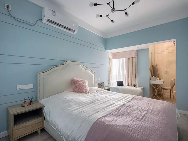 主卧墙壁采用浅蓝色的格调,在床头还设计了精美的缝线,使得卧室显得更加时尚有线条感。奶白色大床非常高贵典雅,高高的床头与蓝色的背景墙非常好的搭配在了一起,显得格外清新自然。飘窗改造成了小书桌,日常办公学习更既轻松。