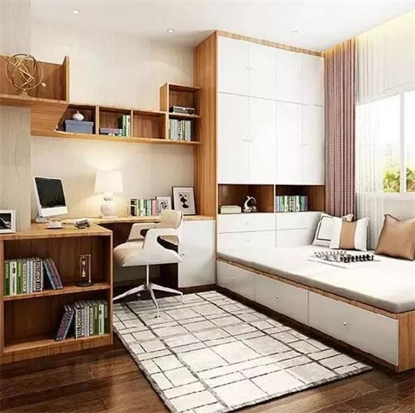 床+衣柜:将床和衣柜设计成一个整体,避免了许多小空间的浪费,同时多出了许多收纳空间。