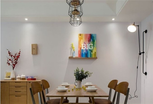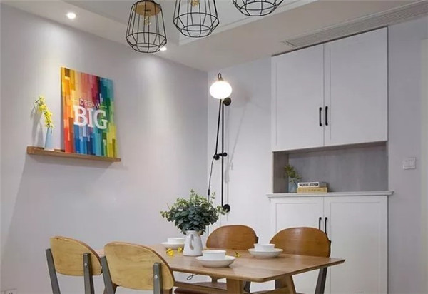 ▲餐厅桌椅和边柜的选择沿用了整体的格调,灯具、绿植、装饰画等搭配让空间简约而不简单。