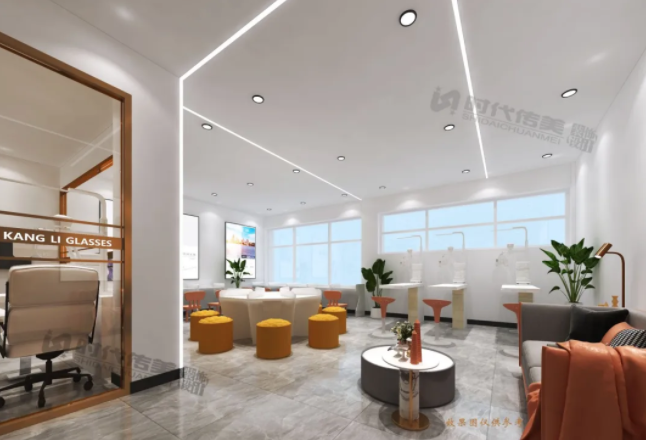 灯条的设计很神奇,好像将天花与墙面连为一体,无限延伸了空间整体视野。验光室的玻璃门+金属元素设计,更是塑造出了空间的多维层次感。