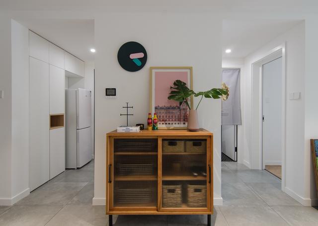 正对门口的位置还做了精心的设计,摆放了浅色的实木柜子,里面还摆放了一些小型储物筐,能够将零散的小件物品分门别类的收纳起来,从而让室内显得更加整齐大方,日常拿取使用也更加便利。在柜子上还摆放了一幅大尺寸的壁画和绿植,简单的装饰能够让你一进门就能感受到文艺与清新。