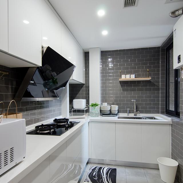 厨房采用白色与黑色拼色的设计,这种撞色的设计,使得厨房显得格外文艺清新,视觉感非常强。白色的橱柜呈L型摆放安装,搭配一组精致的吊柜,将厨房的空间非常好的使用了起来,既美观又能将厨房的物品分门别类的收纳起来,日常做饭拿取使用也更加便利。在厨房还能摆放一些绿植小盆景,简单的装饰能够为厨房增添更多的清新与活力。