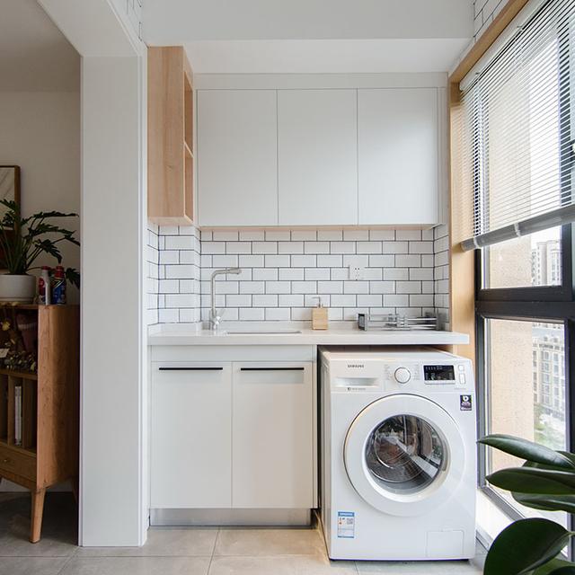 客厅阳台改造成一间洗衣房,与客厅之间采用开放式的设计,还打造了一面大尺寸的落地窗,从而让室内显得更加敞亮。洗衣柜根据户型量身打造,将洗衣机很好的镶嵌在其中,显得非常整齐大方,日常洗衣服更加轻松。