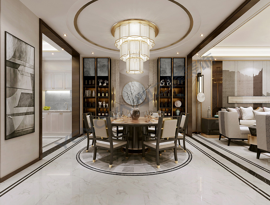 餐厅空间承袭了客厅的装饰手法,烟灰色与深棕色为主色,结合中式几何图纹来呈现。柜体背板与房门颜色一致,这种颜色特别古朴、自然。深棕色的恰当点缀让空间多了几分中式古典韵味,顶面金属线条呼应地面波打线,一上一下由家具本身和墙面水墨装饰画联接起来,统一而华贵。