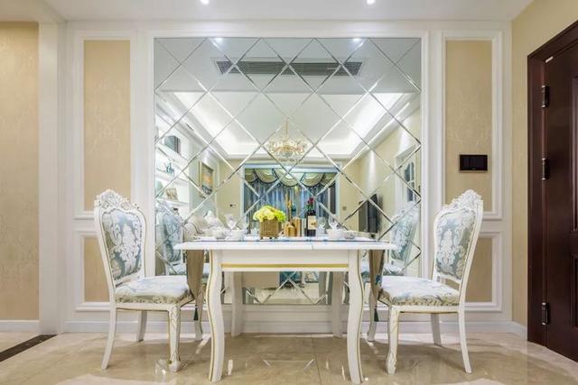 客餐厅没有做明显的隔断,餐厅区域靠墙而设计,为了延伸空间感,做了镜面设计,看起来华丽十足!
