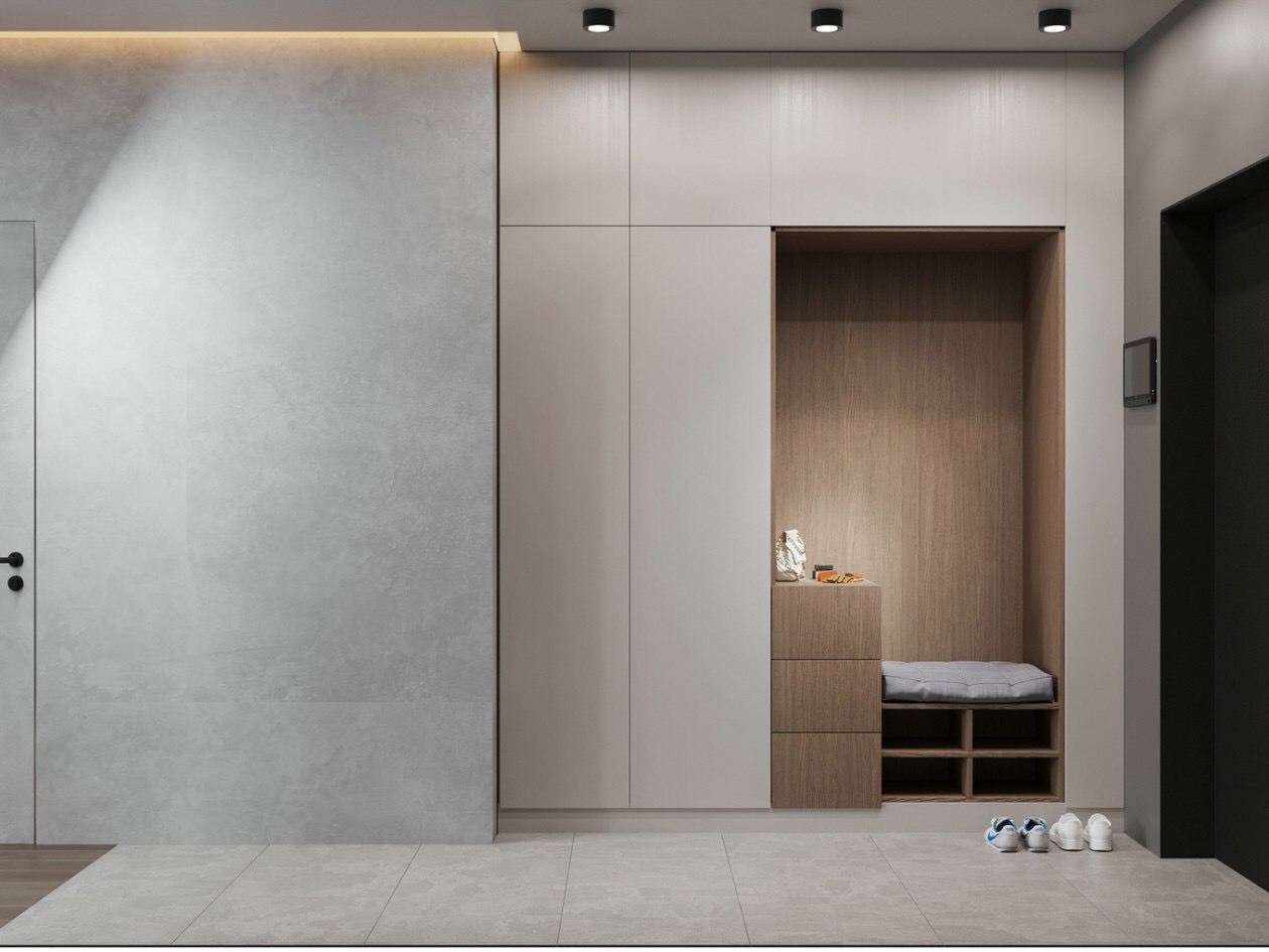 进门玄关处,定制了一个内嵌的鞋柜,可以增加很多收纳空间,另外在空间利用上也设计得很不错,中间预留了换鞋凳,方便坐着进出门换鞋。