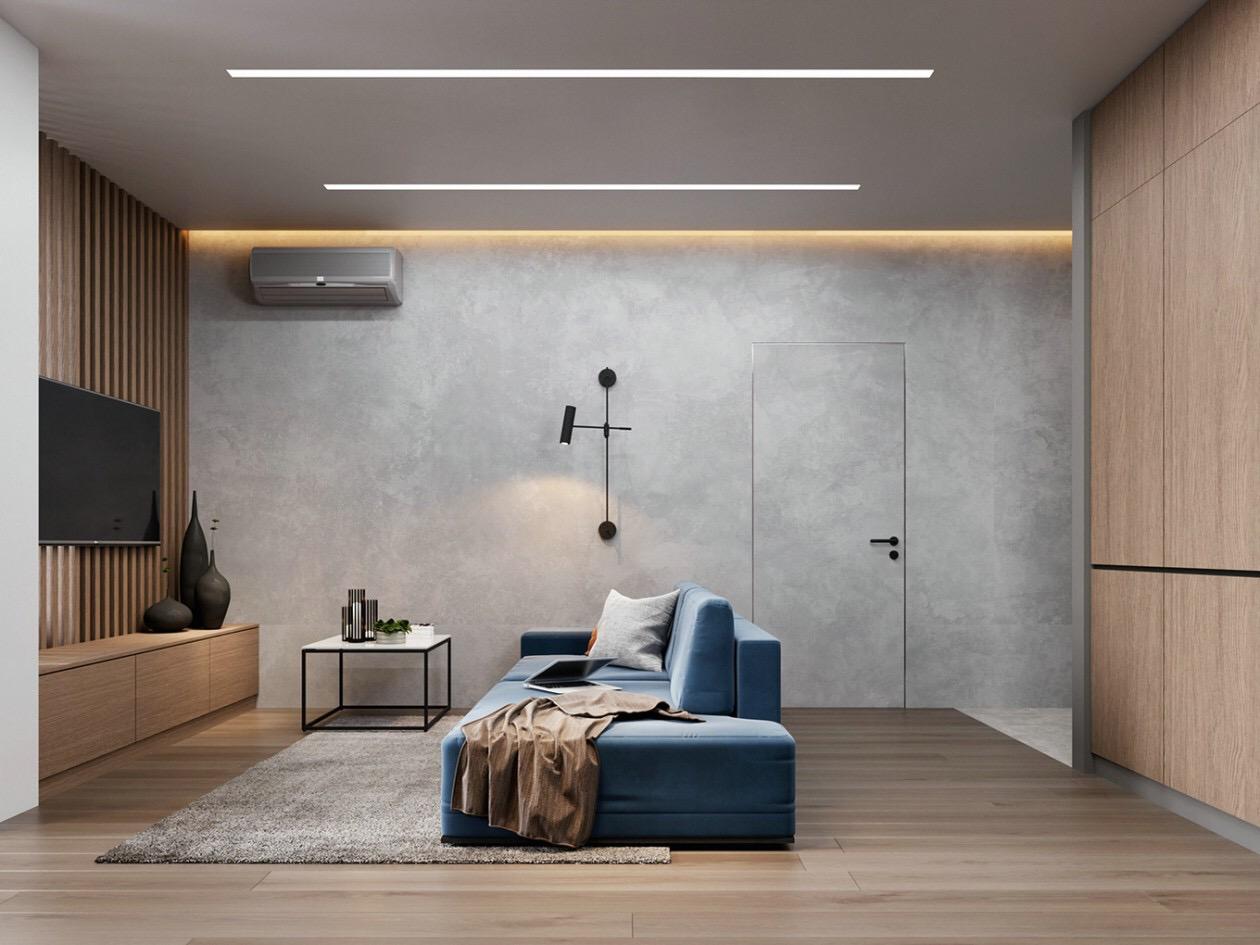 客厅电视是也的定制的,上面做了木格栅条,空间光线显得很通透,小户型可以参考一下。