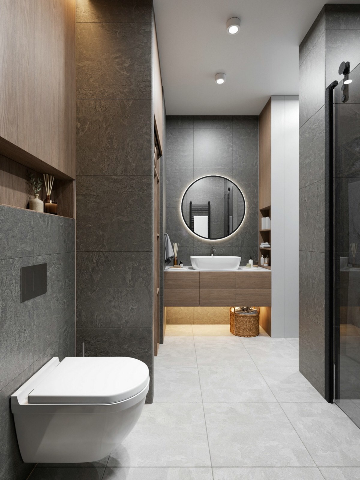 看看卫生间,卫生间的设计也是挺不错的,把空间利用得很好,马桶背面上方做了浅浅的储物柜,也是可以用来摆放一些纸巾和其它小件物品的。