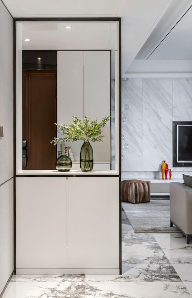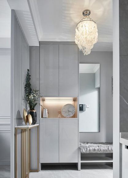 在玄关处安装一个长镜子是最 好不过的,出门时方便整理自己仪容,保持一个干净整洁的状态出门。如果墙面上不能安装,可以设计在玄关壁橱中。