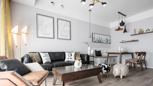 06-18哥们家100平米的三居室,以灰色系为主,搭配一些精美的软装,把新房装修成浪漫北欧风格调。餐客厅之间采用开放式,墙壁上还采用了浅灰色的格调,还装饰了一组精美的壁画,能够让室内显得更加文艺有情调。